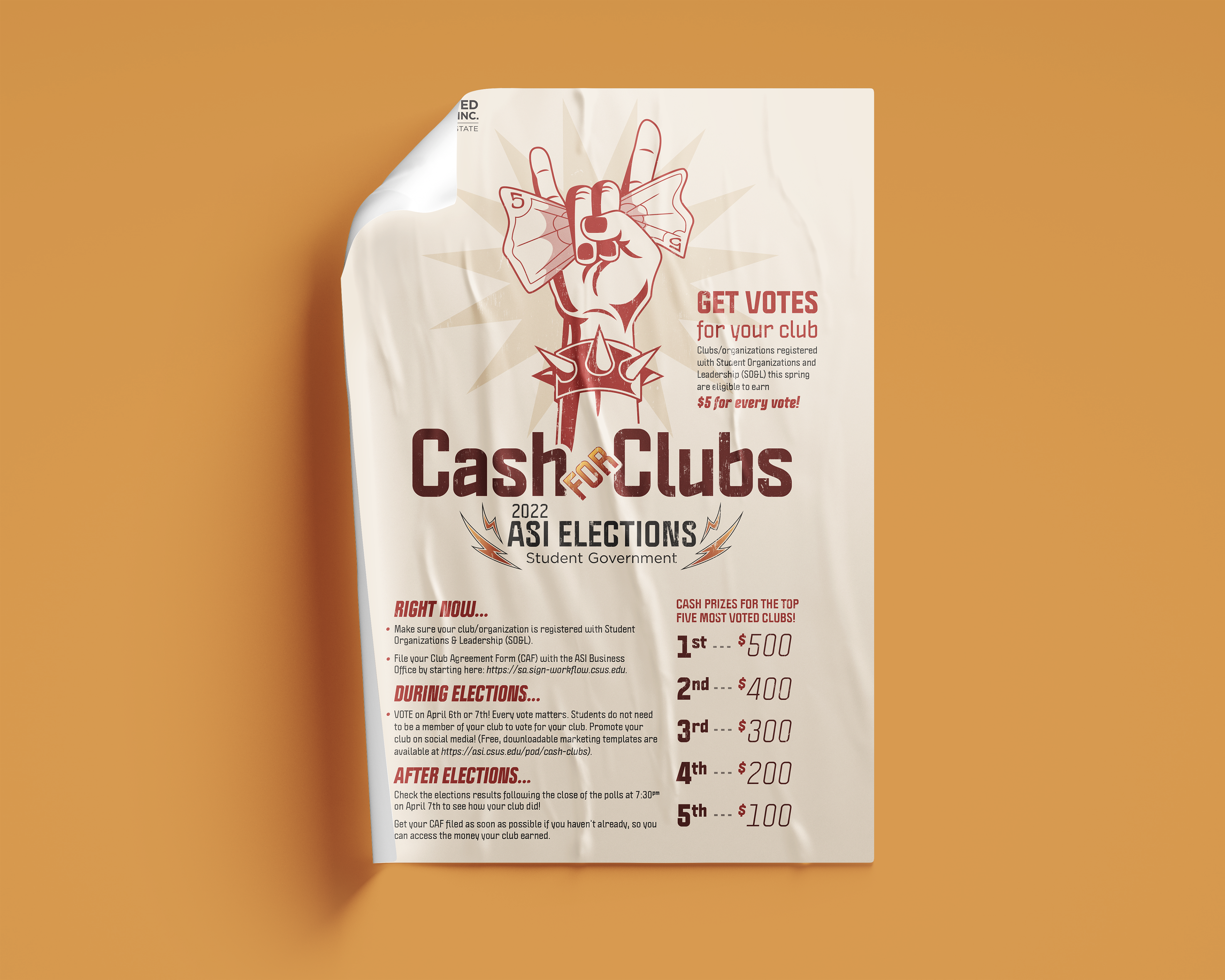 This graphic encourages students to vote for clubs on campus where clubs get five dollars for every vote they receive during student elections. It was inspired by rock bands and vintage rock posters.