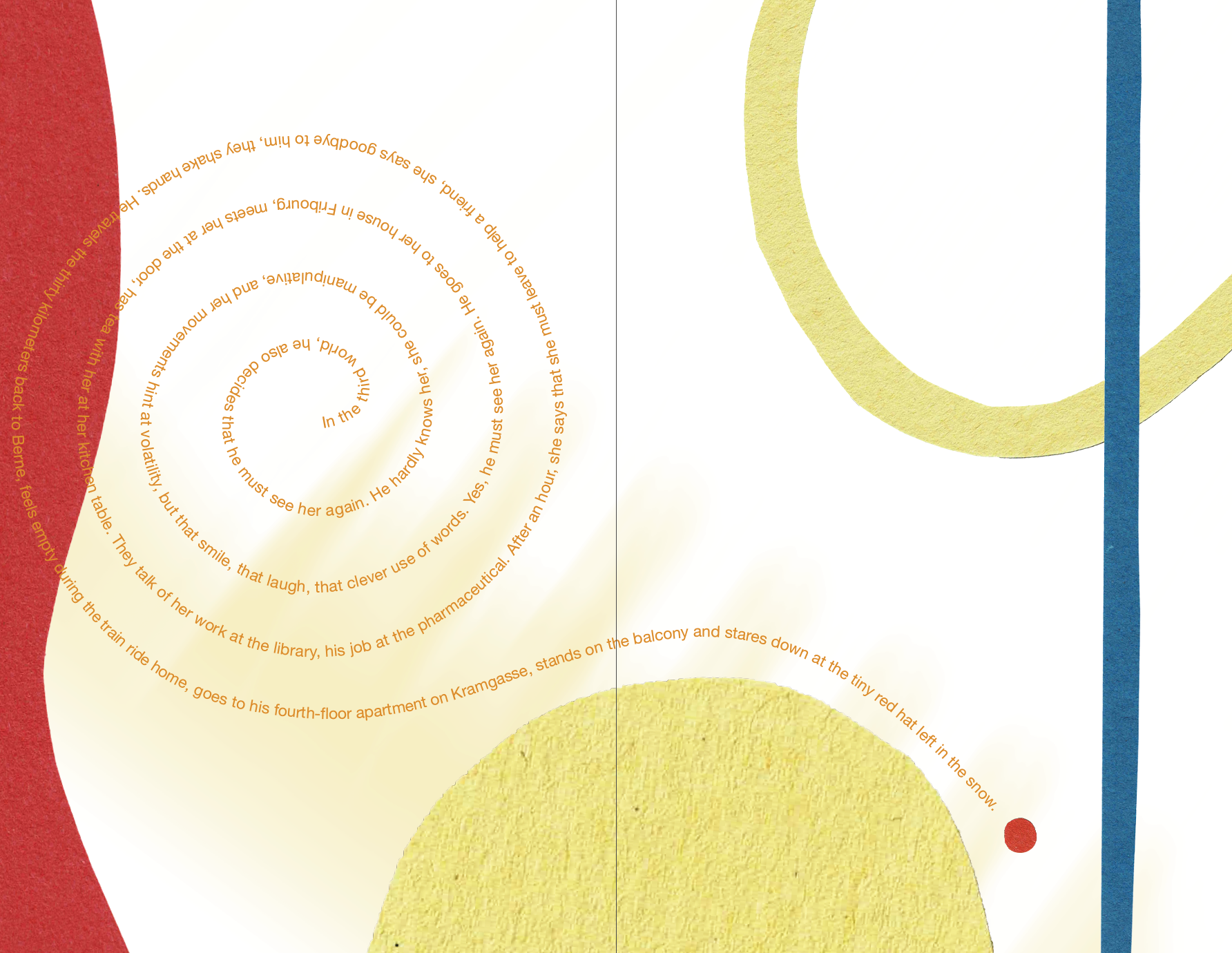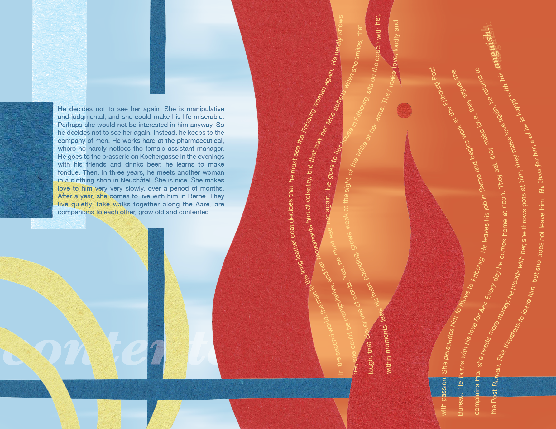 Einstein’s Dreams, written by Alan Lightman, is a series of descriptive vignettes. These two spreads abstractly represent the chapter entitled “April 4th, 1905.” This miniature magazine was created by cutting out and scanning pieces of colored paper and lined pages of a notebook before layering typography over it.